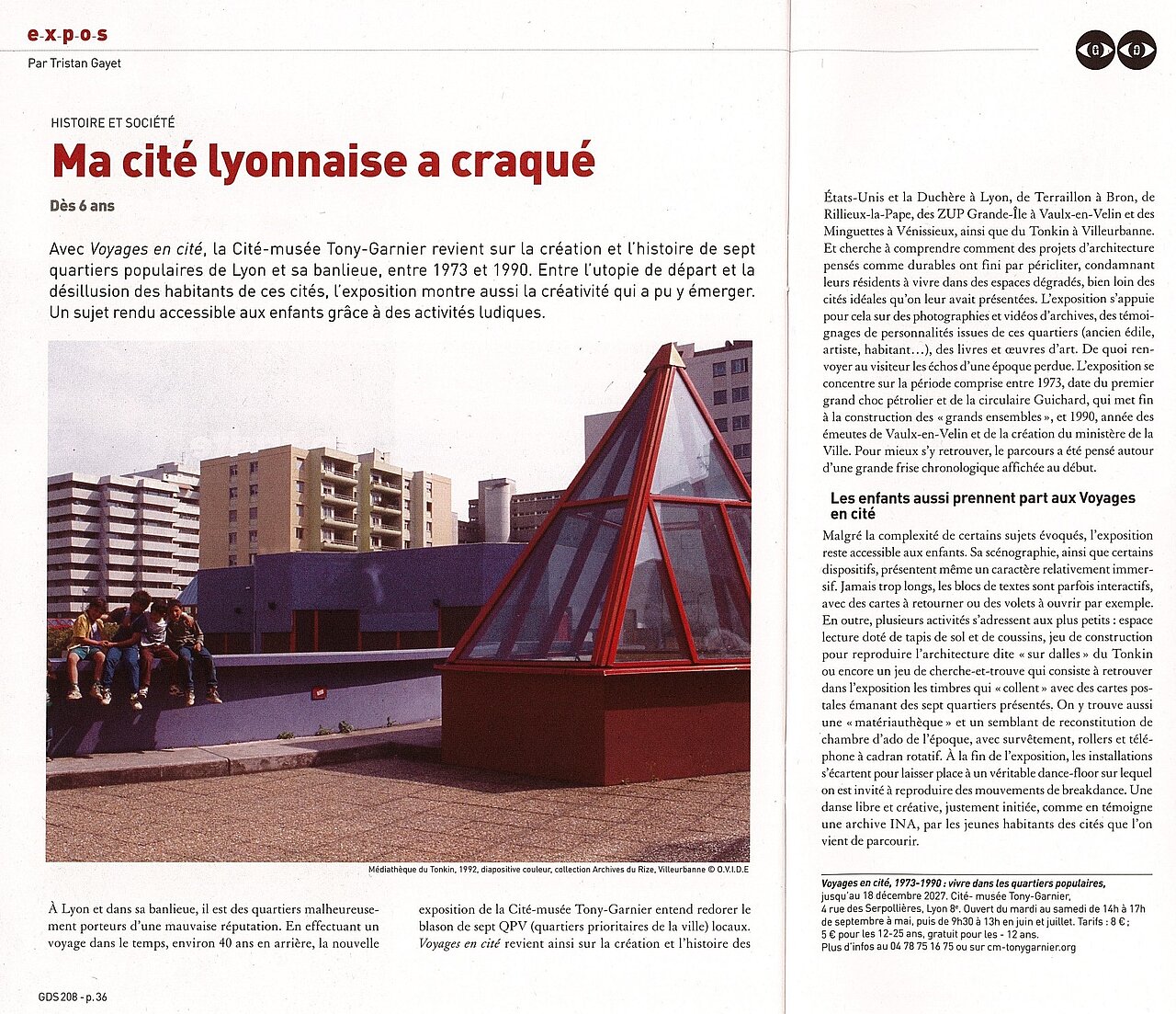 L'exposition « Voyages en cité » est une invitation au(x) voyage(s) à travers plusieurs quartiers populaires et villes de l’agglomération lyonnaise. Il s’agit à la fois d’un voyage dans le temps – puisque la période qui nous intéresse démarre en 1973, date du premier choc pétrolier, pour se terminer au début des années 1990 –, et d’un voyage dans l’espace de la métropole lyonnaise, à la rencontre de la diversité de ses quartiers populaires.
